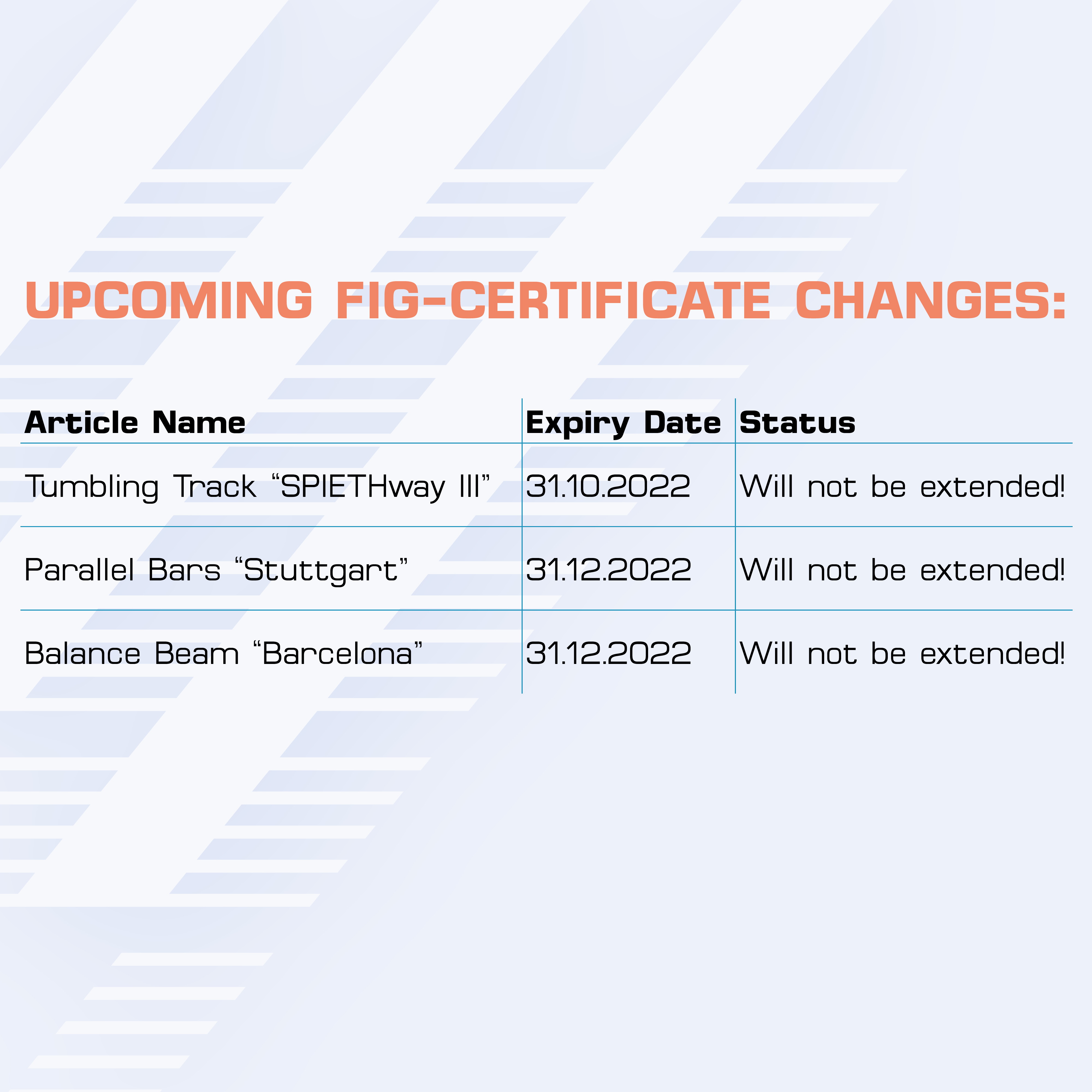 Valid FIG-Certificates are not a matter of course, it is a yearly ongoing process to, which ends in a permanent valid certificate for plenty of our apparatuses. Following we give you an overview about the upcoming changes for 2022/2023 (please click on the picture).