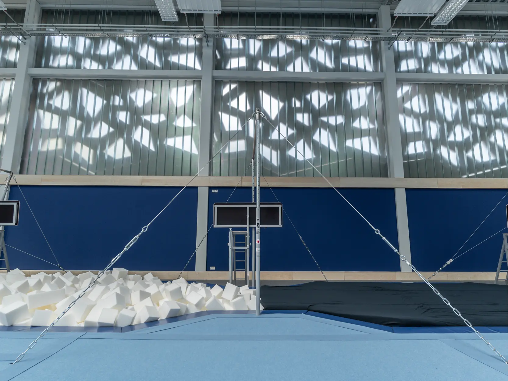 New development in sandwich construction with a core combined of polyether and polyethylene foam. Additional edge stabilization and durable velour surface in spiethblue colour. The cover is made of textile-reinforced PVC material and has patented handgrips at the sides making moving and handling of mats very easy. The hand grips also provide necessary air circulation thus ensuring optimal damping during landings. A special latticed polyester material is integrated between the different foam layers to provide longer durability. The edge stabilization at all sides ensures additional safety an also longer durability of the mats. All the mats are supplied with washable anti-slop Bisonyl bottom. The mat cover has the sewed-on Velcro strips at all sides to have a complete landing area when several mats fixed together. To avoid the gaps between mats, there also the covering stripes of the same velour with a thin velcro available. The covering stripes supplied upon request.